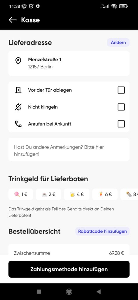 4. Überprüfe deine Lieferadresse, füge bei Bedarf Anmerkungen hinzu, wähle Trinkgeld für den Lieferboten und gebe deinen Rabattcode ein.